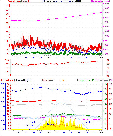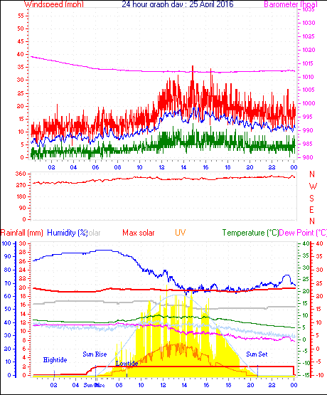 Maximum windspeed = 38.0 mph from 180°( S ) on day 01 at time 17:30